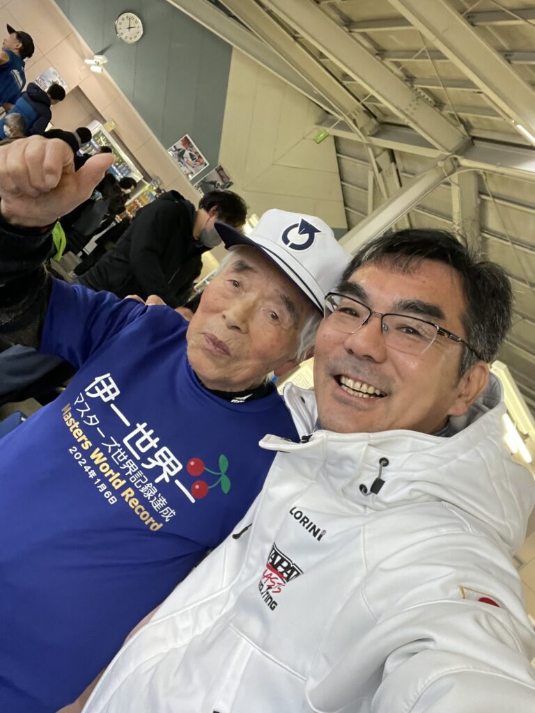 ステージの主役の一人は、世界の丸茂伊一氏(1929年生まれ)。世界最高齢スピードスケート競技者のギネス記録保持者(93歳282日)が一年ぶりに氷上に戻ってきた。今年2024年は、丸茂氏にとっては節目の年。500m、1000m完走によるギネス記録(94歳282日)更新の他に、国際スケート連盟(ISU)、及び国際マスターズスピードスケート委員会(IMSSC)の年齢区分規定(6月30日時点の年齢適用)で、4月1日生まれの丸茂氏は、ISU&IMSSCの新しい年齢区分である初の95歳部門でのチャレンジで、正に前人未到の95歳部門記録が樹立されることになる大役があった。